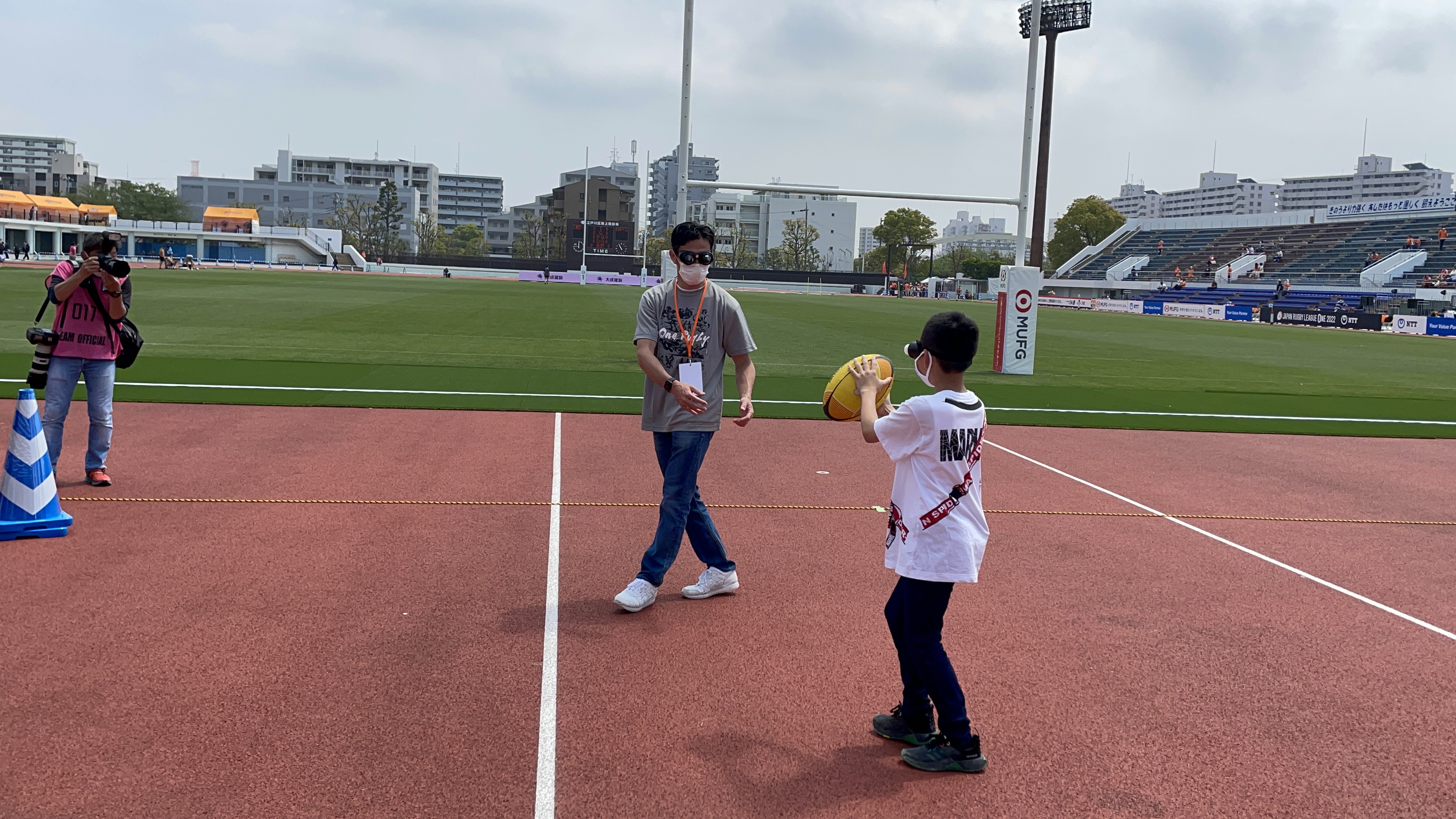 また、One Rugbyの活動として、視覚障がい者(弱視)がプレーするラグビー、”ブラインドラグビー”の体験会を実施。廣瀬も視覚障がい者の方の視界が擬似体験できるゴーグルをかけ、参加者の方々と一緒にボールのパス回しなど身体を動かし、楽しみながら”目だけに頼らないコミュニケーション”の重要性も感じるきっかけとなりました。