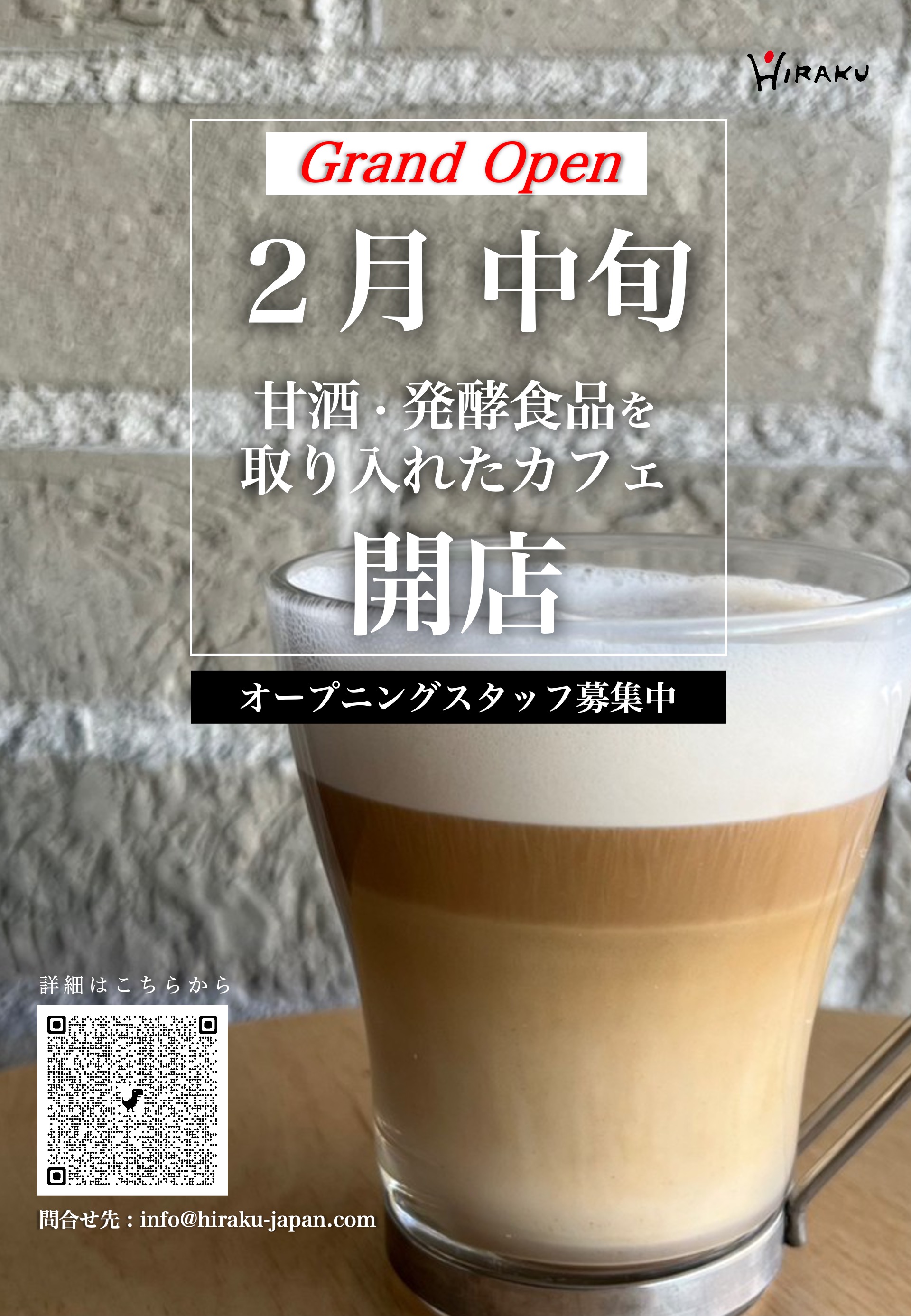 甘酒など発酵食品をつかったお菓子やドリンクを提供するカフェのオープニングスタッフを募集します。