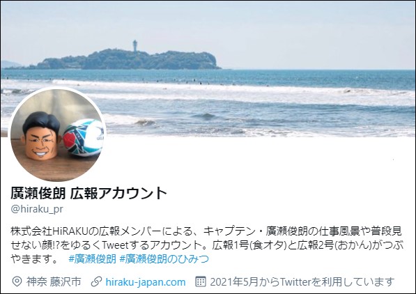 株式会社HiRAKUの広報メンバーによるキャプテン・廣瀬俊朗の仕事風景や普段見せない顔!?をゆるくTweetするアカウント。